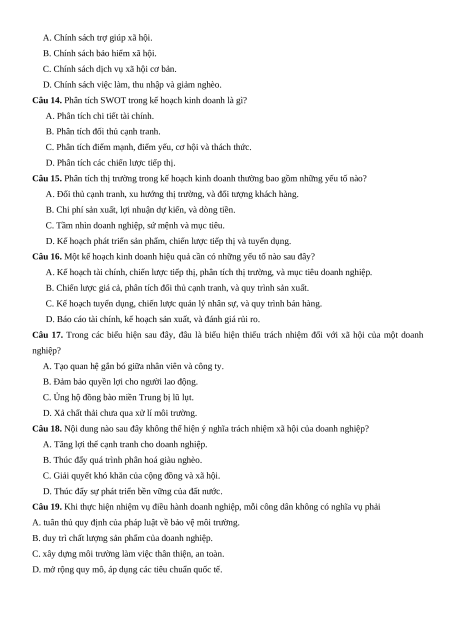 Câu 16. Một kế hoạch kinh doanh hiệu quả cần có những yếu tố nào sau đây?