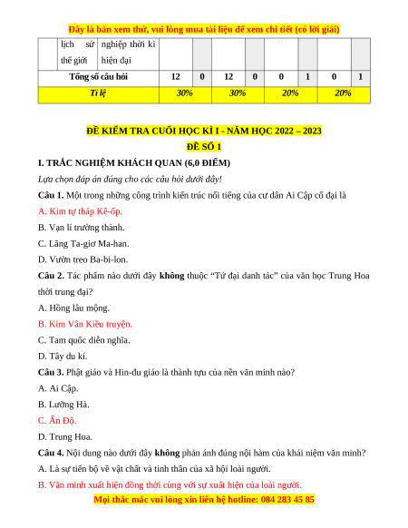 Câu 1. Một trong những công trình kiến trúc nổi tiếng của cư dân Ai Cập cổ đại là A. Kim tự tháp Kê-ốp. B. Vạn lí trường thành. C. Lăng Ta-giơ Ma-han. D. Vườn treo Ba-bi-lon.