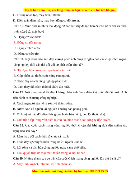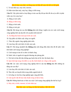 Câu 13. Phát minh nào dưới đây không phải là thành tựu của Cách mạng công nghiệp lần thứ nhất? A. Máy kéo sợi Gien-ni. B. Động cơ hơi nước. C. Đầu máy xe lửa. D. Máy tính điện tử.
