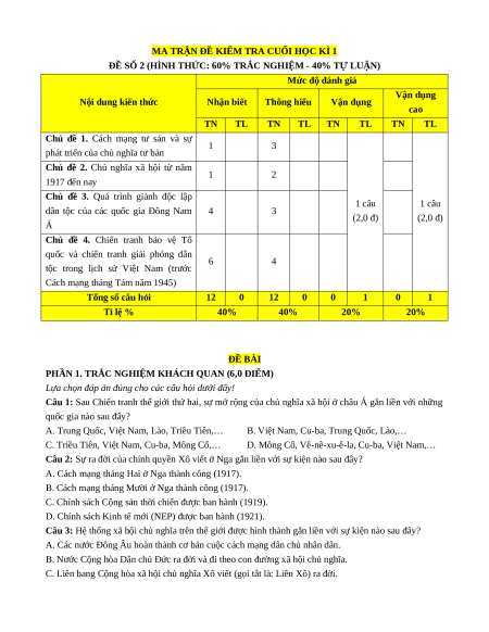 Cách mạng tháng Tám năm 1945) Tổng số câu hỏi 12 0 12 0 0 1 0 1 Tỉ lệ % 40% 40% 20% 20% ĐỀ BÀI
