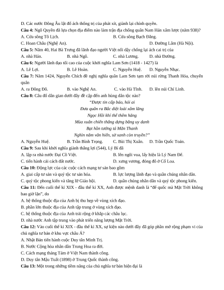 Câu 7: Năm 1424, Nguyễn Chích đề nghị nghĩa quân Lam Sơn tạm rời núi rừng Thanh Hóa, chuyển quân A. ra Đông Đô. B. vào Nghệ An. C. vào Hà Tĩnh. D. lên núi Chí Linh.