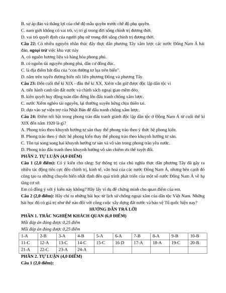 Câu 24: Điểm nổi bật trong phong trào đấu tranh giành độc lập dân tộc ở Đông Nam Á từ cuối thế kỉ