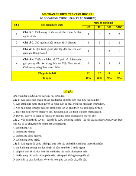 Cách mạng tháng Tám năm 1945) Tổng số câu hỏi 12 12 8 8 Tỉ lệ % 40% 40% 20% 20% ĐỀ BÀI