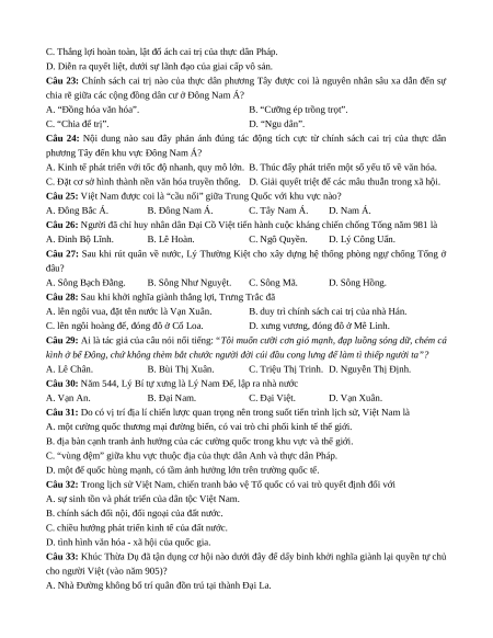 Câu 31: Do có vị trí địa lí chiến lược quan trọng nên trong suốt tiến trình lịch sử, Việt Nam là