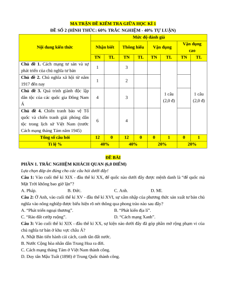 Cách mạng tháng Tám năm 1945) Tổng số câu hỏi 12 0 12 0 0 1 0 1 Tỉ lệ % 40% 40% 20% 20% ĐỀ BÀI