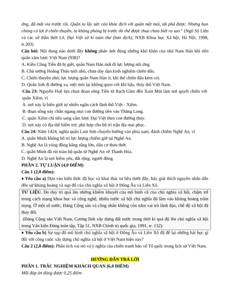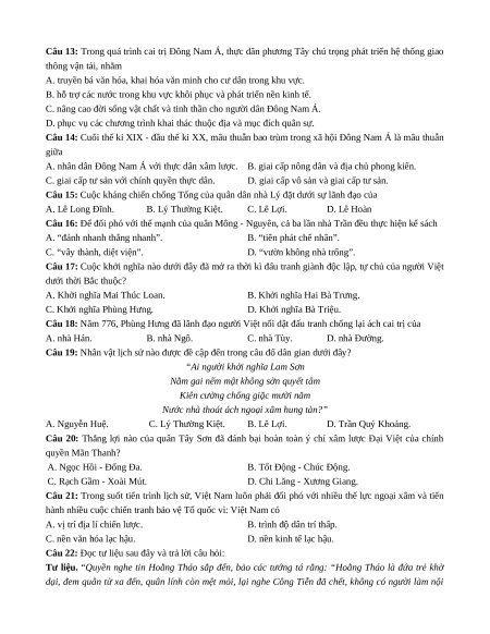 Câu 21: Trong suốt tiến trình lịch sử, Việt Nam luôn phải đối phó với nhiều thế lực ngoại xâm và tiến
