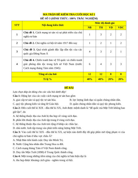 Cách mạng tháng Tám năm 1945) Tổng số câu hỏi 12 12 8 8 Tỉ lệ % 40% 40% 20% 20% ĐỀ BÀI