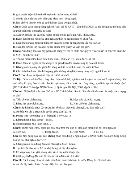 Câu 9: Trước năm 1945, quốc gia duy nhất trên thế giới đi theo con đường xã hội chủ nghĩa là A. Liên Xô. B. Trung Quốc. C. Việt Nam. D. Cu-ba.