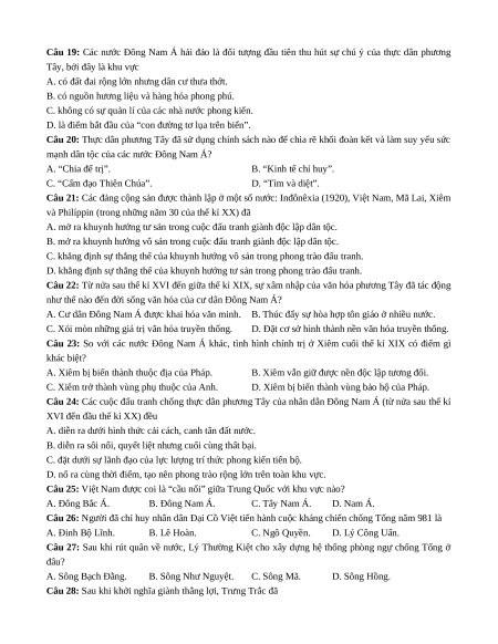 Câu 17: Trong những năm cuối thế kỉ XIX - đầu thế kỉ XX, nhân dân Cam-pu-chia không tiến hành