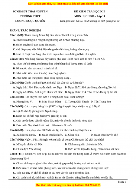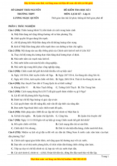 Đề thi cuối kì 1 Lịch sử 11 trường THPT Lương Ngọc Quyến - Thái Nguyên