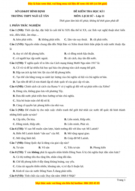 Đề thi cuối kì 1 Lịch sử 11 trường THPT Ngô Lê Tân - Bình Định