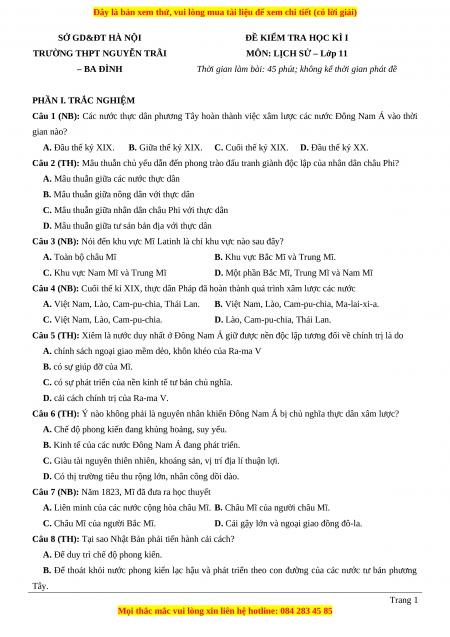 Đề thi cuối kì 1 Lịch sử 11 trường THPT Nguyễn Trãi - Hà Nội