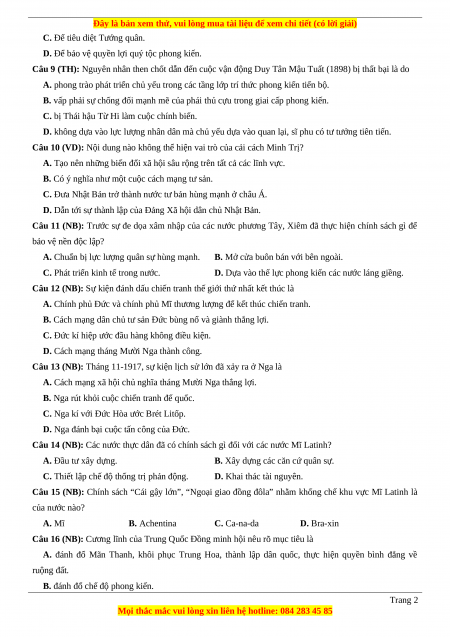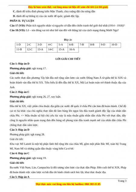 D. đánh đổ sự thống trị của các nước đế quốc, giành độc lập. PHẦN II. TỰ LUẬN