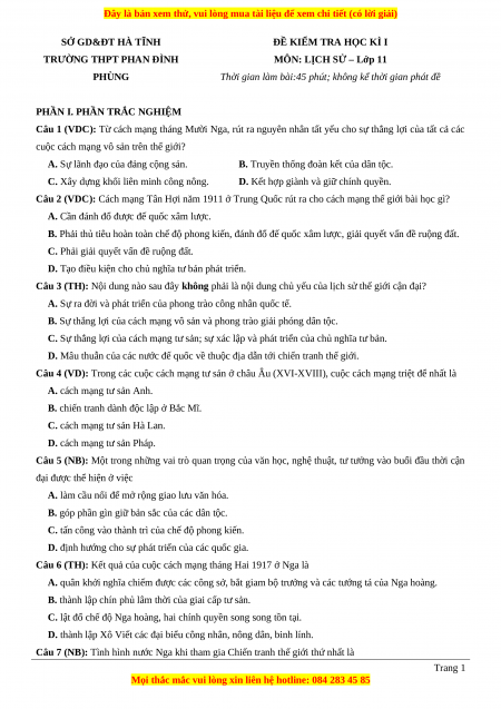 Đề thi cuối kì 1 Lịch sử 11 trường THPT Phan Đình Phùng - Hà Tĩnh