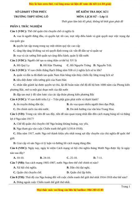 Đề thi cuối kì 1 Lịch sử 11 trường THPT Sông Lô - Vĩnh Phúc