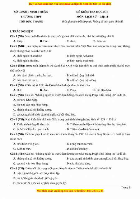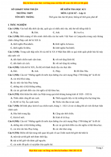 Đề thi cuối kì 1 Lịch sử 11 trường THPT Tôn Đức Thắng - Ninh Thuận