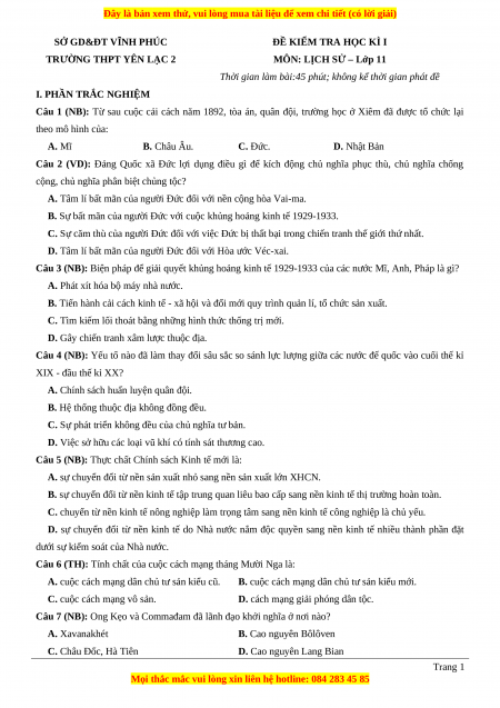 Đề thi cuối kì 1 Lịch sử 11 trường THPT Yên Lạc 2 - Vĩnh Phúc
