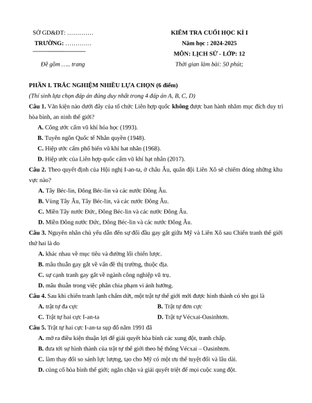 Đề thi Cuối kì 1 Lịch sử 12 Cánh diều 2024 (Đề 3)