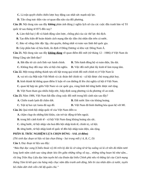 (Thí sinh lựa chọn đáp án đúng duy nhất trong 4 đáp án A, B, C, D)