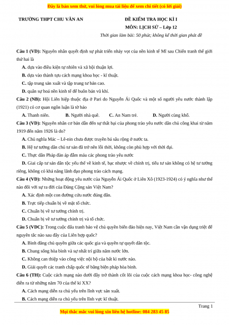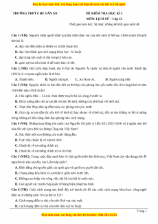 Đề thi cuối kì 1 Lịch sử 12 năm 2023 Trường THPT Chu Văn An - Hà Nội