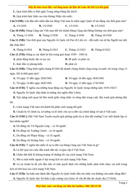 Câu 9 (NB): Lần đầu tiên nhân dân lao động Việt nam kỉ niệm ngày Quốc tế lao động vào thời gian nào? A. 1/5/1929 B. 1/5/1930 C. 1/5/1931 D. 1/5/1933