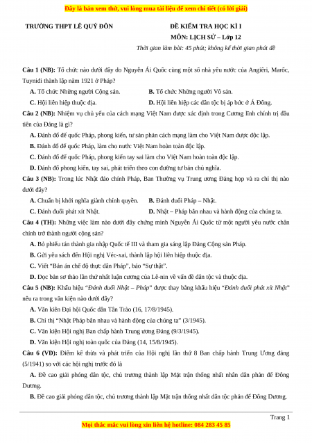 Đề thi cuối kì 1 Lịch sử 12 năm 2023 Trường THPT Lê Quý Đôn