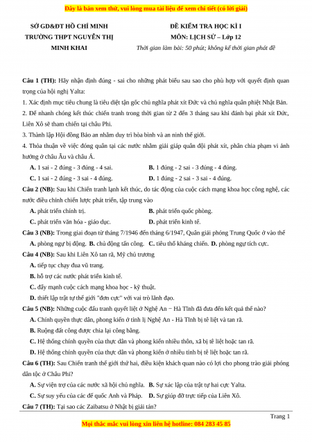 MÔN: LỊCH SỬ – Lớp 12 MINH KHAI