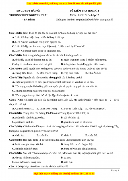 Đề thi cuối kì 1 Lịch sử 12 năm 2023 Trường THPT Nguyễn Trãi - Hà Nội