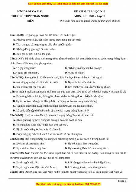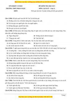 Đề thi cuối kì 1 Lịch sử 12 năm 2023 Trường THPT Phan Ngọc Hiển - Cà Mau