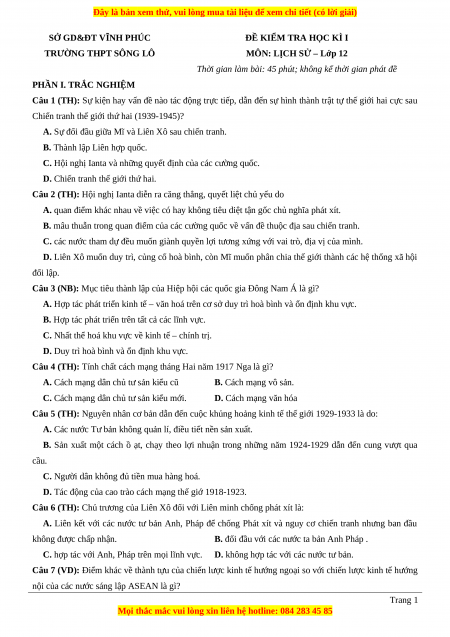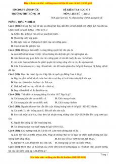 Đề thi cuối kì 1 Lịch sử 12 năm 2023 Trường THPT Sông Lô - Vĩnh Phúc