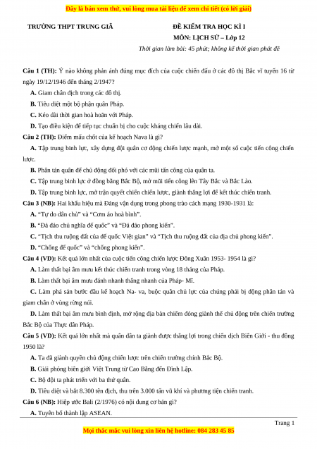 Đề thi cuối kì 1 Lịch sử 12 năm 2023 Trường THPT Trung Giã - Hà Nội