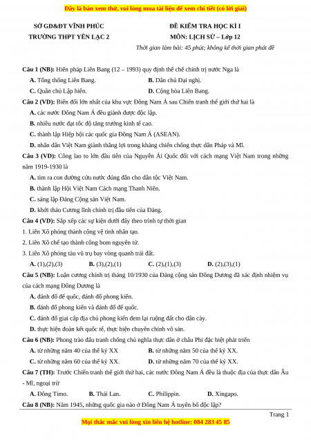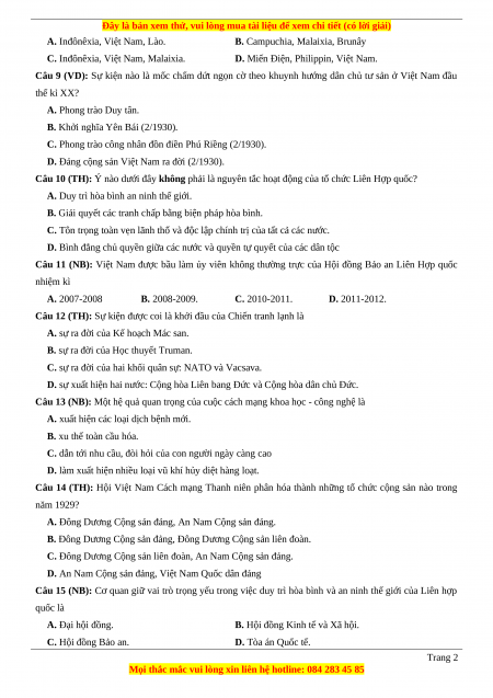 Câu 8 (NB): Năm 1945, những quốc gia nào ở Đông Nam Á tuyên bố độc lập? Trang 1
