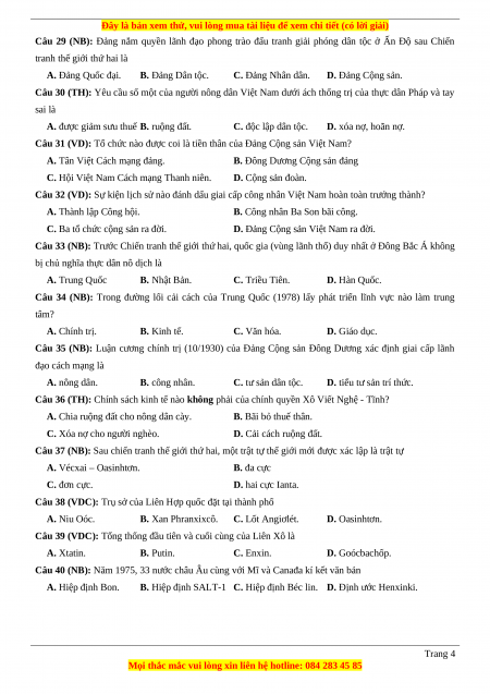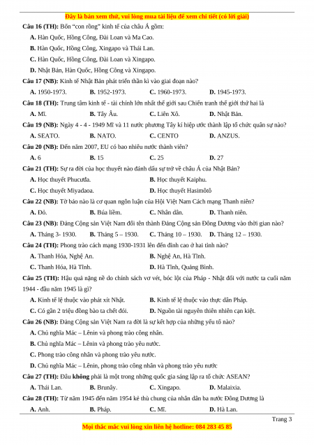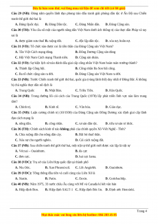 Câu 28 (TH): Từ năm 1945 đến năm 1954 kẻ thù chung của nhân dân ba nước Đông Dương là A. Anh. B. Pháp. C. Mĩ. D. Hà Lan. Trang 3