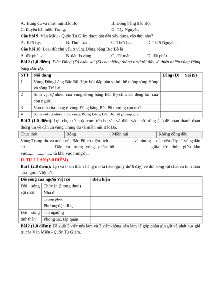 Bài 2 (1,0 điểm). Điền Đúng (Đ) hoặc sai (S) cho những thông tin dưới đây về thiên nhiên vùng Đồng bằng Bắc Bộ. STT Nội dung Đúng (Đ) Sai (S) 1