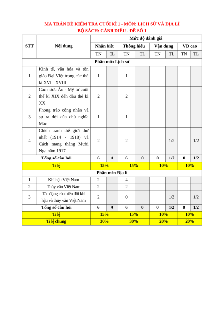 BỘ SÁCH: CÁNH DIỀU - ĐỀ SỐ 1 Mức độ đánh giá STT Nội dung Nhận biết Thông hiểu Vận dụng VD cao TN TL TN TL TN TL TN TL Phân môn Lịch sử Kinh tế, văn hóa và tôn 1