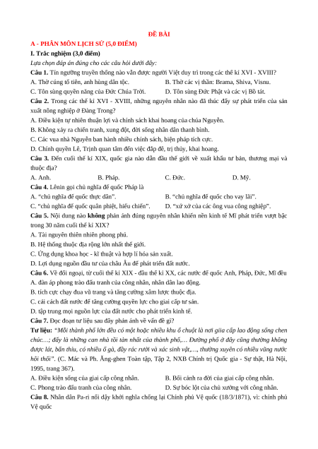 A - PHÂN MÔN LỊCH SỬ (5,0 ĐIỂM)