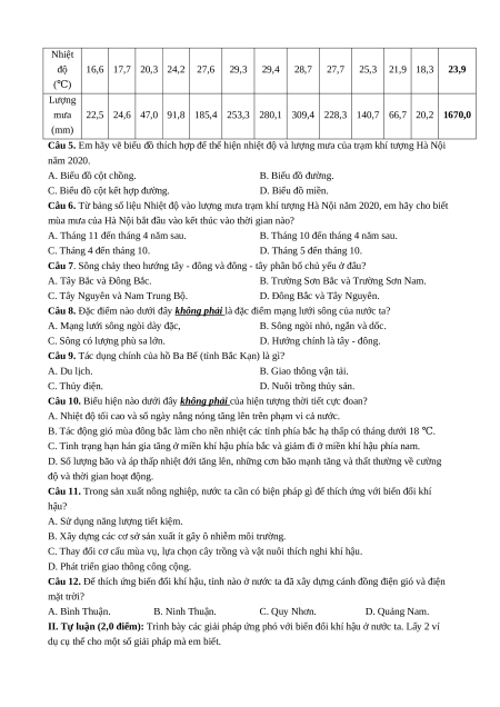 Câu 6. Từ bảng số liệu Nhiệt độ vào lượng mưa trạm khí tượng Hà Nội năm 2020, em hãy cho biết