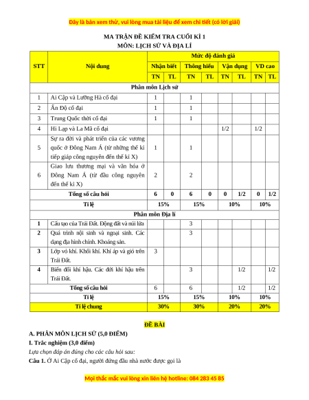 Đông Nam Á (từ đầu công nguyên 2 2 đến thế kỉ X) Tổng số câu hỏi 6 0 6 0 0 1/2 0 1/2 Tỉ lệ 15% 15% 10% 10% Phân môn Địa lí 1