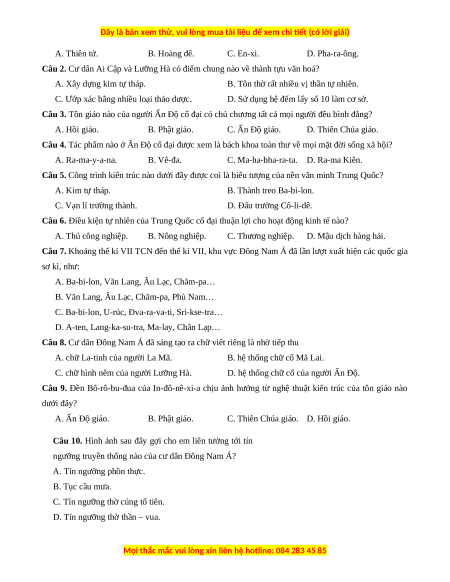 Câu 9. Đền Bô-rô-bu-đua của In-đô-nê-xi-a chịu ảnh hưởng từ nghệ thuật kiến trúc của tôn giáo nào dưới đây? A. Ấn Độ giáo. B. Phật giáo.