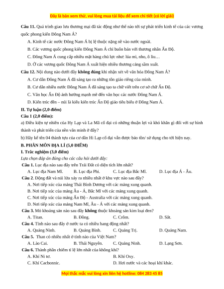 Câu 7. Khoảng thế kỉ VII TCN đến thế kỉ VII, khu vực Đông Nam Á đã lần lượt xuất hiện các quốc gia sơ kì, như: