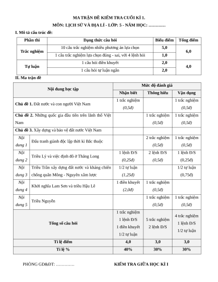 Khởi nghĩa Lam Sơn và triều Hậu Lê dung 4 (2,0đ) (0,5đ) Nội 1 trắc nghiệm 1 trắc nghiệm Triều Nguyễn dung 5 (0,5đ) (0,5đ) 1 trắc nghiệm 4 trắc nghiệm 1 lệnh Đ/S 5 trắc nghiệm Tổng số câu hỏi 1 lệnh Đ/S 1 điền khuyết 2 lệnh Đ/S 1/2 tự luận 1/2 tự luận Tỉ lệ điểm 4,0 3,0 3,0 Tỉ lệ % 40% 30% 30%