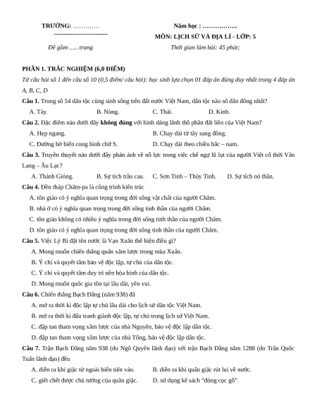 MÔN: LỊCH SỬ VÀ ĐỊA LÍ - LỚP: 5 - NĂM HỌC: …………