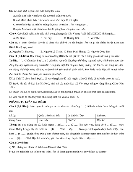 Câu 1 (2,0 điểm): Lựa chọn các từ/ cụm từ cho sẵn sào chỗ trống (…..) để hoàn thành đoạn thông tin dưới đây Lê Lợi