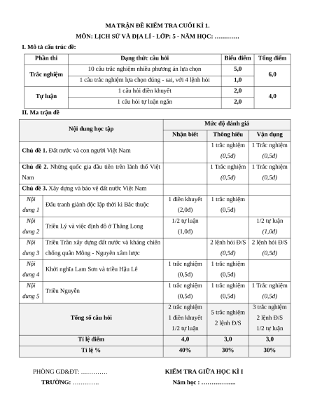 Khởi nghĩa Lam Sơn và triều Hậu Lê dung 4 (0,5đ) (0,5đ) Nội 1 trắc nghiệm 1 trắc nghiệm 1 Trắc nghiệm Triều Nguyễn dung 5 (0,5đ) (0,5đ) (0,5đ) 2 trắc nghiệm 3 trắc nghiệm 5 trắc nghiệm Tổng số câu hỏi 1 điền khuyết 2 lệnh Đ/S 2 lệnh Đ/S 1/2 tự luận 1/2 tự luận Tỉ lệ điểm 4,0 3,0 3,0 Tỉ lệ % 40% 30% 30%
