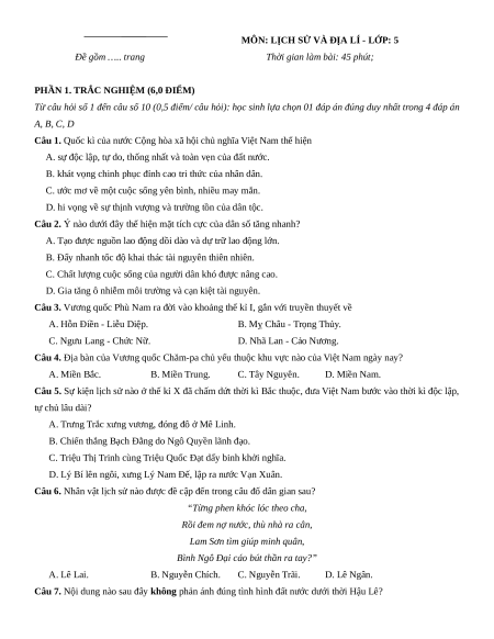MÔN: LỊCH SỬ VÀ ĐỊA LÍ - LỚP: 5 Đề gồm ….. trang