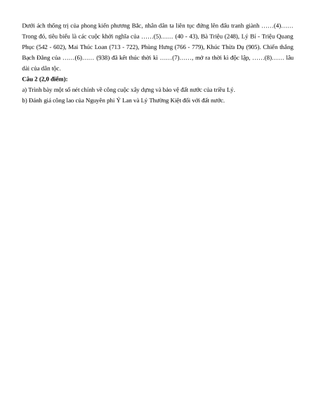 Bạch Đằng của ……(6)…… (938) đã kết thúc thời kì ……(7)……, mở ra thời kì độc lập, ……(8)…… lâu dài của dân tộc. Câu 2 (2,0 điểm):