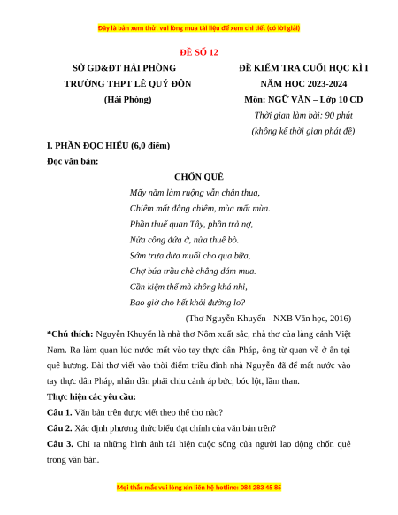 I. PHẦN ĐỌC HIỂU (6,0 điểm) Đọc văn bản: CHỐN QUÊ
