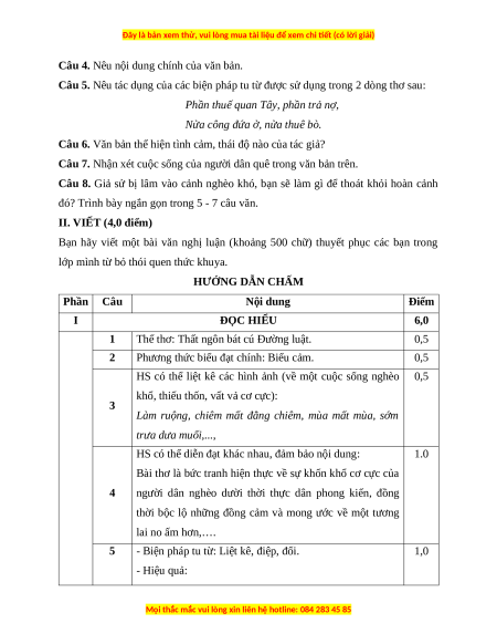 lớp mình từ bỏ thói quen thức khuya. HƯỚNG DẪN CHẤM Phần Câu Nội dung Điểm I ĐỌC HIỂU 6,0 1