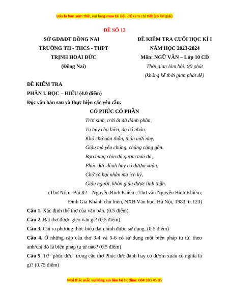 Môn: NGỮ VĂN – Lớp 10 CD (Đồng Nai)