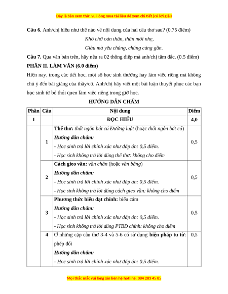 học sinh từ bỏ thói quen làm việc riêng trong giờ học. HƯỚNG DẪN CHẤM Phần Câu Nội dung Điểm I ĐỌC HIỂU 4,0